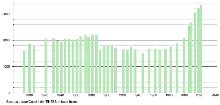 L'évolution du nombre d'habitants est connue à travers les recensements de la population effectués dans la commune depuis 1793. Pour les communes de moins de 10 000 habitants, une enquête de recensement portant sur toute la population est réalisée tous les cinq ans, les populations légales des années intermédiaires étant quant à elles estimées par interpolation ou extrapolation[30]. Pour la commune, le premier recensement exhaustif entrant dans le cadre du nouveau dispositif a été réalisé en 2008[31].