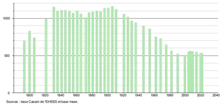 L'évolution du nombre d'habitants est connue à travers les recensements de la population effectués dans la commune depuis 1793. Pour les communes de moins de 10 000 habitants, une enquête de recensement portant sur toute la population est réalisée tous les cinq ans, les populations légales des années intermédiaires étant quant à elles estimées par interpolation ou extrapolation[26]. Pour la commune, le premier recensement exhaustif entrant dans le cadre du nouveau dispositif a été réalisé en 2004[27].