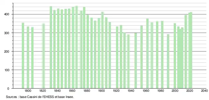 L'évolution du nombre d'habitants est connue à travers les recensements de la population effectués dans la commune depuis 1793. Pour les communes de moins de 10 000 habitants, une enquête de recensement portant sur toute la population est réalisée tous les cinq ans, les populations légales des années intermédiaires étant quant à elles estimées par interpolation ou extrapolation[28]. Pour la commune, le premier recensement exhaustif entrant dans le cadre du nouveau dispositif a été réalisé en 2004[29].