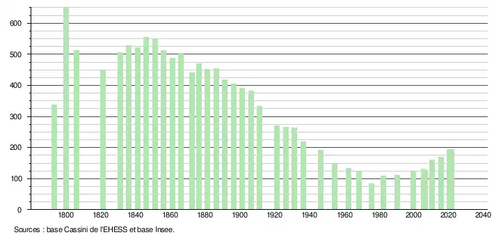 L'évolution du nombre d'habitants est connue à travers les recensements de la population effectués dans la commune depuis 1793. Pour les communes de moins de 10 000 habitants, une enquête de recensement portant sur toute la population est réalisée tous les cinq ans, les populations légales des années intermédiaires étant quant à elles estimées par interpolation ou extrapolation[29]. Pour la commune, le premier recensement exhaustif entrant dans le cadre du nouveau dispositif a été réalisé en 2005[30].