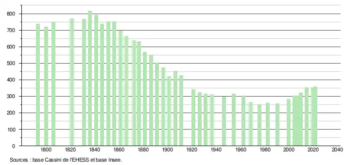L'évolution du nombre d'habitants est connue à travers les recensements de la population effectués dans la commune depuis 1793. Pour les communes de moins de 10 000 habitants, une enquête de recensement portant sur toute la population est réalisée tous les cinq ans, les populations légales des années intermédiaires étant quant à elles estimées par interpolation ou extrapolation[26]. Pour la commune, le premier recensement exhaustif entrant dans le cadre du nouveau dispositif a été réalisé en 2004[27].