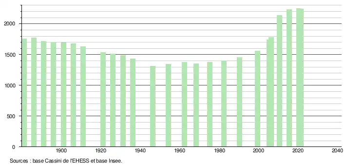 L'évolution du nombre d'habitants est connue à travers les recensements de la population effectués dans la commune depuis 1881. Pour les communes de moins de 10 000 habitants, une enquête de recensement portant sur toute la population est réalisée tous les cinq ans, les populations légales des années intermédiaires étant quant à elles estimées par interpolation ou extrapolation[17]. Pour la commune, le premier recensement exhaustif entrant dans le cadre du nouveau dispositif a été réalisé en 2005[18].