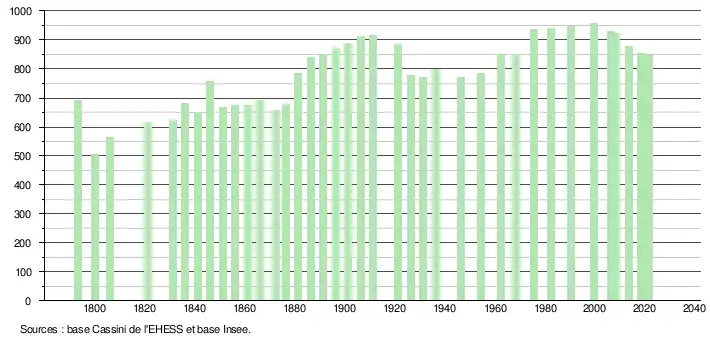 L'évolution du nombre d'habitants est connue à travers les recensements de la population effectués dans la commune depuis 1793. Pour les communes de moins de 10 000 habitants, une enquête de recensement portant sur toute la population est réalisée tous les cinq ans, les populations légales des années intermédiaires étant quant à elles estimées par interpolation ou extrapolation[22]. Pour la commune, le premier recensement exhaustif entrant dans le cadre du nouveau dispositif a été réalisé en 2008[23].