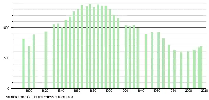L'évolution du nombre d'habitants est connue à travers les recensements de la population effectués dans la commune depuis 1793. Pour les communes de moins de 10 000 habitants, une enquête de recensement portant sur toute la population est réalisée tous les cinq ans, les populations légales des années intermédiaires étant quant à elles estimées par interpolation ou extrapolation[13]. Pour la commune, le premier recensement exhaustif entrant dans le cadre du nouveau dispositif a été réalisé en 2007[14].