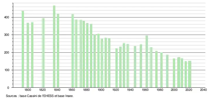 L'évolution du nombre d'habitants est connue à travers les recensements de la population effectués dans la commune depuis 1793. Pour les communes de moins de 10 000 habitants, une enquête de recensement portant sur toute la population est réalisée tous les cinq ans, les populations légales des années intermédiaires étant quant à elles estimées par interpolation ou extrapolation[18]. Pour la commune, le premier recensement exhaustif entrant dans le cadre du nouveau dispositif a été réalisé en 2005[19].