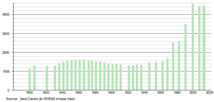 L'évolution du nombre d'habitants est connue à travers les recensements de la population effectués dans la commune depuis 1800. À partir du , les populations légales des communes sont publiées annuellement dans le cadre d'un recensement qui repose désormais sur une collecte d'information annuelle, concernant successivement tous les territoires communaux au cours d'une période de cinq ans. Pour les communes de moins de 10 000 habitants, une enquête de recensement portant sur toute la population est réalisée tous les cinq ans, les populations légales des années intermédiaires étant quant à elles estimées par interpolation ou extrapolation[12]. Pour la commune, le premier recensement exhaustif entrant dans le cadre du nouveau dispositif a été réalisé en 2007[13],[Note 1].