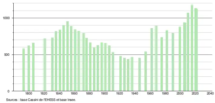 L'évolution du nombre d'habitants est connue à travers les recensements de la population effectués dans la commune depuis 1793. Pour les communes de moins de 10 000 habitants, une enquête de recensement portant sur toute la population est réalisée tous les cinq ans, les populations légales des années intermédiaires étant quant à elles estimées par interpolation ou extrapolation[20]. Pour la commune, le premier recensement exhaustif entrant dans le cadre du nouveau dispositif a été réalisé en 2005[21].