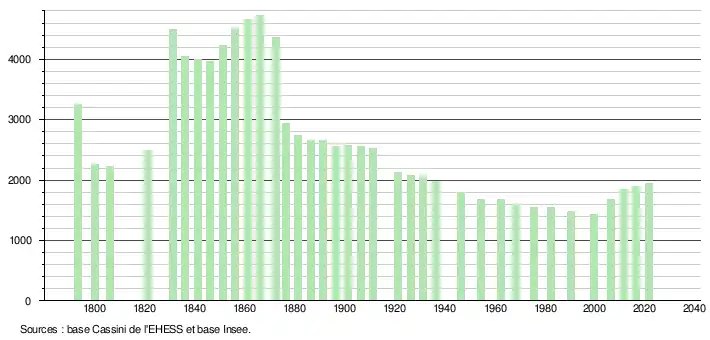 L'évolution du nombre d'habitants est connue à travers les recensements de la population effectués dans la commune depuis 1793. Pour les communes de moins de 10 000 habitants, une enquête de recensement portant sur toute la population est réalisée tous les cinq ans, les populations légales des années intermédiaires étant quant à elles estimées par interpolation ou extrapolation[16]. Pour la commune, le premier recensement exhaustif entrant dans le cadre du nouveau dispositif a été réalisé en 2006[17].