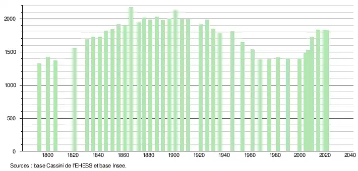 L'évolution du nombre d'habitants est connue à travers les recensements de la population effectués dans la commune depuis 1793. Pour les communes de moins de 10 000 habitants, une enquête de recensement portant sur toute la population est réalisée tous les cinq ans, les populations légales des années intermédiaires étant quant à elles estimées par interpolation ou extrapolation[28]. Pour la commune, le premier recensement exhaustif entrant dans le cadre du nouveau dispositif a été réalisé en 2004[29].