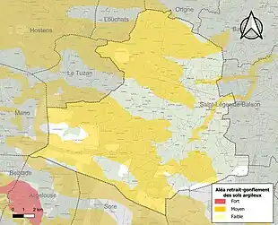 Le retrait-gonflement des sols argileux est susceptible d'engendrer des dommages importants aux bâtiments en cas d’alternance de périodes de sécheresse et de pluie. 62,8 % de la superficie communale est en aléa moyen ou fort (67,4 % au niveau départemental et 48,5 % au niveau national). Sur les 915 bâtiments dénombrés sur la commune en 2019, 197 sont en aléa moyen ou fort, soit 22 %, à comparer aux 84 % au niveau départemental et 54 % au niveau national. Une cartographie de l'exposition du territoire national au retrait gonflement des sols argileux est disponible sur le site du BRGM[21],[Carte 2].