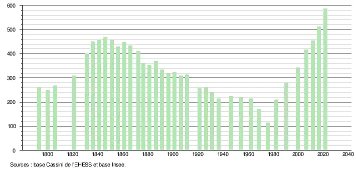 L'évolution du nombre d'habitants est connue à travers les recensements de la population effectués dans la commune depuis 1793. Pour les communes de moins de 10 000 habitants, une enquête de recensement portant sur toute la population est réalisée tous les cinq ans, les populations légales des années intermédiaires étant quant à elles estimées par interpolation ou extrapolation[15]. Pour la commune, le premier recensement exhaustif entrant dans le cadre du nouveau dispositif a été réalisé en 2006[16].