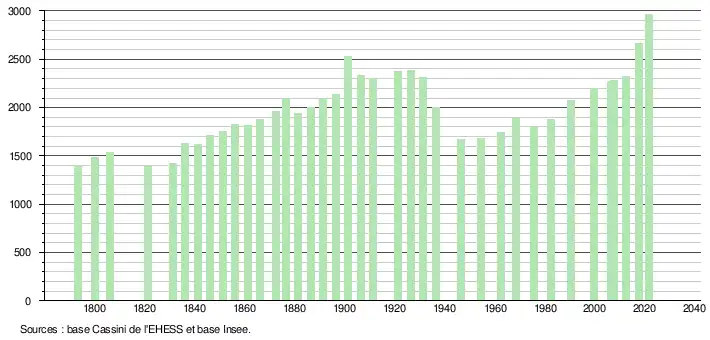 L'évolution du nombre d'habitants est connue à travers les recensements de la population effectués dans la commune depuis 1793. Pour les communes de moins de 10 000 habitants, une enquête de recensement portant sur toute la population est réalisée tous les cinq ans, les populations légales des années intermédiaires étant quant à elles estimées par interpolation ou extrapolation[36]. Pour la commune, le premier recensement exhaustif entrant dans le cadre du nouveau dispositif a été réalisé en 2007[37].