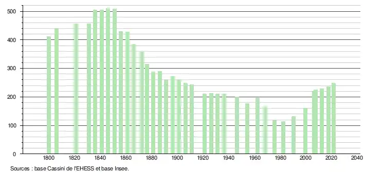 L'évolution du nombre d'habitants est connue à travers les recensements de la population effectués dans la commune depuis 1800. Pour les communes de moins de 10 000 habitants, une enquête de recensement portant sur toute la population est réalisée tous les cinq ans, les populations légales des années intermédiaires étant quant à elles estimées par interpolation ou extrapolation[24]. Pour la commune, le premier recensement exhaustif entrant dans le cadre du nouveau dispositif a été réalisé en 2007[25].