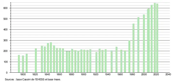 L'évolution du nombre d'habitants est connue à travers les recensements de la population effectués dans la commune depuis 1793. Pour les communes de moins de 10 000 habitants, une enquête de recensement portant sur toute la population est réalisée tous les cinq ans, les populations légales des années intermédiaires étant quant à elles estimées par interpolation ou extrapolation[31]. Pour la commune, le premier recensement exhaustif entrant dans le cadre du nouveau dispositif a été réalisé en 2007[32].
