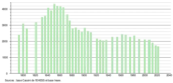 L'évolution du nombre d'habitants est connue à travers les recensements de la population effectués dans la commune depuis 1793. Pour les communes de moins de 10 000 habitants, une enquête de recensement portant sur toute la population est réalisée tous les cinq ans, les populations légales des années intermédiaires étant quant à elles estimées par interpolation ou extrapolation[73]. Pour la commune, le premier recensement exhaustif entrant dans le cadre du nouveau dispositif a été réalisé en 2007[74].