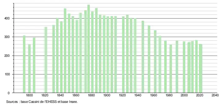 L'évolution du nombre d'habitants est connue à travers les recensements de la population effectués dans la commune depuis 1793. Pour les communes de moins de 10 000 habitants, une enquête de recensement portant sur toute la population est réalisée tous les cinq ans, les populations légales des années intermédiaires étant quant à elles estimées par interpolation ou extrapolation[36]. Pour la commune, le premier recensement exhaustif entrant dans le cadre du nouveau dispositif a été réalisé en 2005[37].