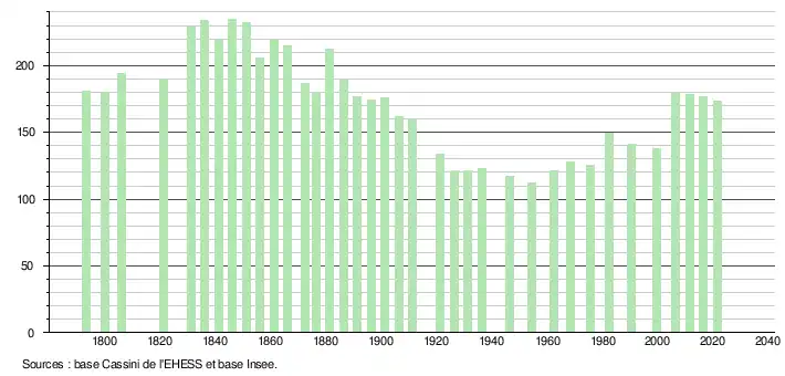 L'évolution du nombre d'habitants est connue à travers les recensements de la population effectués dans la commune depuis 1793. Pour les communes de moins de 10 000 habitants, une enquête de recensement portant sur toute la population est réalisée tous les cinq ans, les populations légales des années intermédiaires étant quant à elles estimées par interpolation ou extrapolation[14]. Pour la commune, le premier recensement exhaustif entrant dans le cadre du nouveau dispositif a été réalisé en 2006[15].