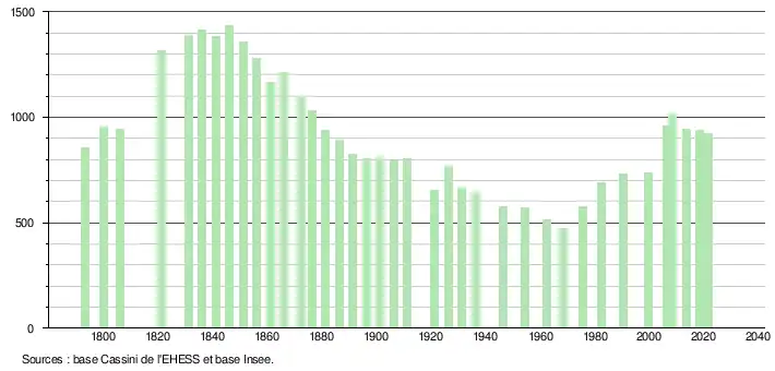L'évolution du nombre d'habitants est connue à travers les recensements de la population effectués dans la commune depuis 1793. Pour les communes de moins de 10 000 habitants, une enquête de recensement portant sur toute la population est réalisée tous les cinq ans, les populations légales des années intermédiaires étant quant à elles estimées par interpolation ou extrapolation[21]. Pour la commune, le premier recensement exhaustif entrant dans le cadre du nouveau dispositif a été réalisé en 2008[22].