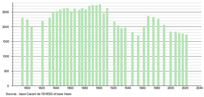 L'évolution du nombre d'habitants est connue à travers les recensements de la population effectués dans la commune depuis 1793. Pour les communes de moins de 10 000 habitants, une enquête de recensement portant sur toute la population est réalisée tous les cinq ans, les populations légales des années intermédiaires étant quant à elles estimées par interpolation ou extrapolation[18]. Pour la commune, le premier recensement exhaustif entrant dans le cadre du nouveau dispositif a été réalisé en 2006[19].