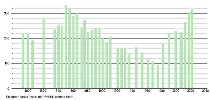 L'évolution du nombre d'habitants est connue à travers les recensements de la population effectués dans la commune depuis 1793. Pour les communes de moins de 10 000 habitants, une enquête de recensement portant sur toute la population est réalisée tous les cinq ans, les populations légales des années intermédiaires étant quant à elles estimées par interpolation ou extrapolation[14]. Pour la commune, le premier recensement exhaustif entrant dans le cadre du nouveau dispositif a été réalisé en 2007[15].