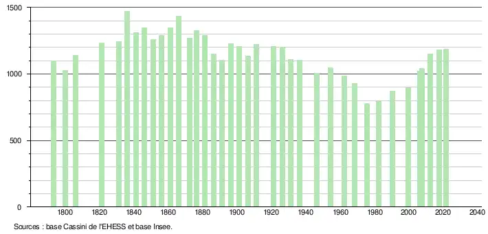 L'évolution du nombre d'habitants est connue à travers les recensements de la population effectués dans la commune depuis 1793. Pour les communes de moins de 10 000 habitants, une enquête de recensement portant sur toute la population est réalisée tous les cinq ans, les populations légales des années intermédiaires étant quant à elles estimées par interpolation ou extrapolation[14]. Pour la commune, le premier recensement exhaustif entrant dans le cadre du nouveau dispositif a été réalisé en 2007[15].