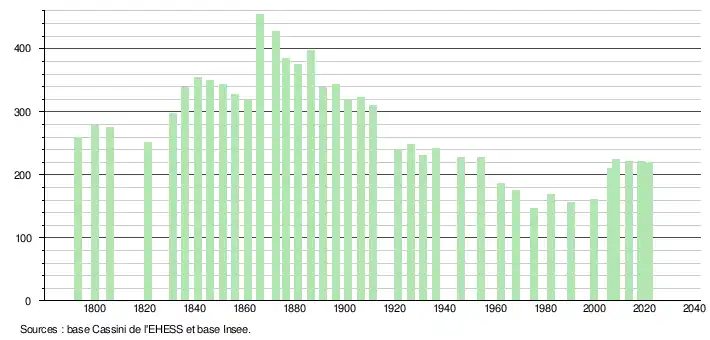 | L'évolution du nombre d'habitants est connue à travers les recensements de la population effectués dans la commune depuis 1793. Pour les communes de moins de 10 000 habitants, une enquête de recensement portant sur toute la population est réalisée tous les cinq ans, les populations légales des années intermédiaires étant quant à elles estimées par interpolation ou extrapolation[37]. Pour la commune, le premier recensement exhaustif entrant dans le cadre du nouveau dispositif a été réalisé en 2008[38]. En 2021, la commune comptait 219 habitants[Note 7], en diminution de 12,4 % par rapport à 2015 (Ariège : +1,38 %, France hors Mayotte : +1,84 %). |