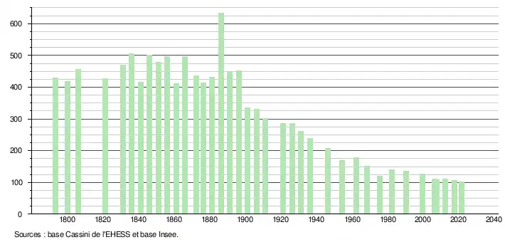 L'évolution du nombre d'habitants est connue à travers les recensements de la population effectués dans la commune depuis 1793. Pour les communes de moins de 10 000 habitants, une enquête de recensement portant sur toute la population est réalisée tous les cinq ans, les populations légales des années intermédiaires étant quant à elles estimées par interpolation ou extrapolation[12]. Pour la commune, le premier recensement exhaustif entrant dans le cadre du nouveau dispositif a été réalisé en 2007[13].