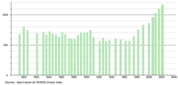 L'évolution du nombre d'habitants est connue à travers les recensements de la population effectués dans la commune depuis 1793. Pour les communes de moins de 10 000 habitants, une enquête de recensement portant sur toute la population est réalisée tous les cinq ans, les populations légales des années intermédiaires étant quant à elles estimées par interpolation ou extrapolation[21]. Pour la commune, le premier recensement exhaustif entrant dans le cadre du nouveau dispositif a été réalisé en 2005[22].