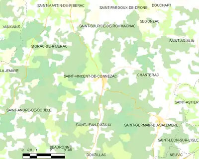 Saint-Vincent-de-Connezac est limitrophe de six autres communes, dont Beauronne au sud-ouest sur environ 150 mètres. Au nord-est, son territoire est distant d'une dizaine de mètres de celui de Segonzac et d'environ 70 mètres de celui de Saint-Pardoux-de-Drône.