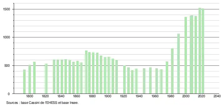 L'évolution du nombre d'habitants est connue à travers les recensements de la population effectués dans la commune depuis 1793. Pour les communes de moins de 10 000 habitants, une enquête de recensement portant sur toute la population est réalisée tous les cinq ans, les populations légales des années intermédiaires étant quant à elles estimées par interpolation ou extrapolation[25]. Pour la commune, le premier recensement exhaustif entrant dans le cadre du nouveau dispositif a été réalisé en 2007[26].