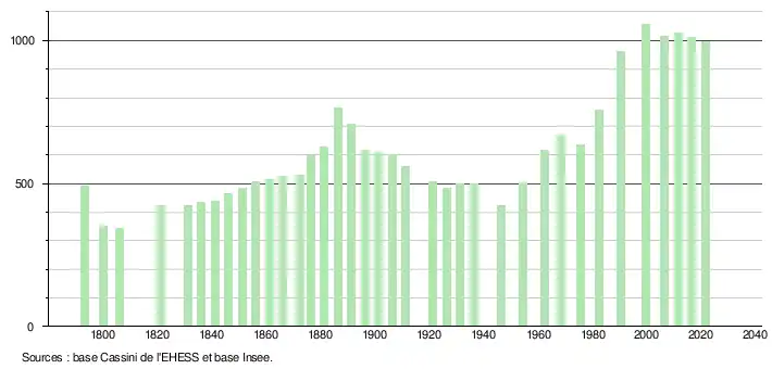 L'évolution du nombre d'habitants est connue à travers les recensements de la population effectués dans la commune depuis 1793. Pour les communes de moins de 10 000 habitants, une enquête de recensement portant sur toute la population est réalisée tous les cinq ans, les populations légales des années intermédiaires étant quant à elles estimées par interpolation ou extrapolation[41]. Pour la commune, le premier recensement exhaustif entrant dans le cadre du nouveau dispositif a été réalisé en 2006[42].