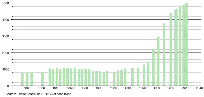 L'évolution du nombre d'habitants est connue à travers les recensements de la population effectués dans la commune depuis 1793. Pour les communes de moins de 10 000 habitants, une enquête de recensement portant sur toute la population est réalisée tous les cinq ans, les populations légales des années intermédiaires étant quant à elles estimées par interpolation ou extrapolation[21]. Pour la commune, le premier recensement exhaustif entrant dans le cadre du nouveau dispositif a été réalisé en 2007[22].