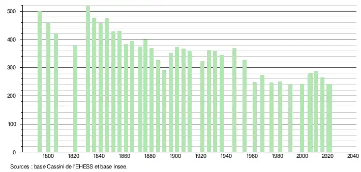 L'évolution du nombre d'habitants est connue à travers les recensements de la population effectués dans la commune depuis 1793. Pour les communes de moins de 10 000 habitants, une enquête de recensement portant sur toute la population est réalisée tous les cinq ans, les populations légales des années intermédiaires étant quant à elles estimées par interpolation ou extrapolation[49]. Pour la commune, le premier recensement exhaustif entrant dans le cadre du nouveau dispositif a été réalisé en 2005[50].