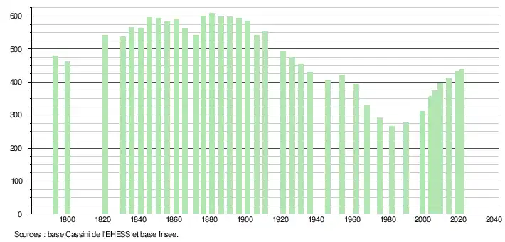 L'évolution du nombre d'habitants est connue à travers les recensements de la population effectués dans la commune depuis 1793. Pour les communes de moins de 10 000 habitants, une enquête de recensement portant sur toute la population est réalisée tous les cinq ans, les populations légales des années intermédiaires étant quant à elles estimées par interpolation ou extrapolation[25]. Pour la commune, le premier recensement exhaustif entrant dans le cadre du nouveau dispositif a été réalisé en 2004[26].