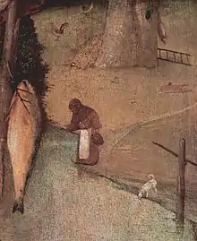 Au fond, on peut voir une ville en feu, des ruines d'un château d'où émerge un dragon devant lequel s'enfuit un homme nu. À gauche, à l'avant, des restes d'un navire naufragé dont on perçoit des mâts, ce détail a aussi été vu comme un nasse par Bax[1]. En dessous, la signature de Jérôme Bosch. Un petit oratoire, comme on les trouve souvent au bord des chemins, est cloué au tronc de l’arbre. On y voit aussi une bête morte, peut-être accrochée pour la faire faisander.
