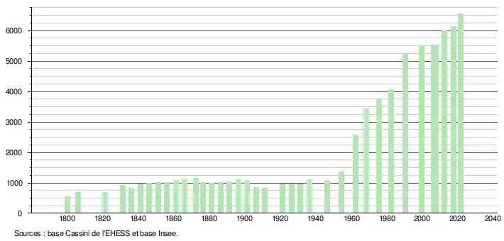 L'évolution du nombre d'habitants est connue à travers les recensements de la population effectués dans la commune depuis 1800. Pour les communes de moins de 10 000 habitants, une enquête de recensement portant sur toute la population est réalisée tous les cinq ans, les populations légales des années intermédiaires étant quant à elles estimées par interpolation ou extrapolation[21]. Pour la commune, le premier recensement exhaustif entrant dans le cadre du nouveau dispositif a été réalisé en 2007[22].