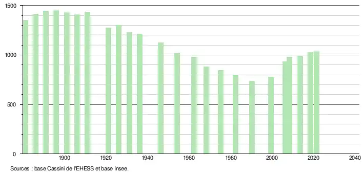 L'évolution du nombre d'habitants est connue à travers les recensements de la population effectués dans la commune depuis 1881. Pour les communes de moins de 10 000 habitants, une enquête de recensement portant sur toute la population est réalisée tous les cinq ans, les populations légales des années intermédiaires étant quant à elles estimées par interpolation ou extrapolation[15]. Pour la commune, le premier recensement exhaustif entrant dans le cadre du nouveau dispositif a été réalisé en 2008[16].
