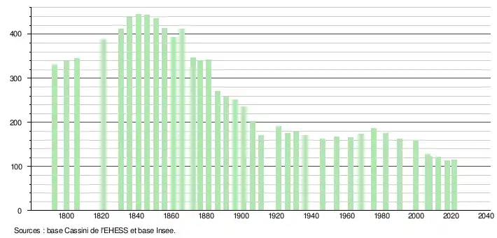 | L'évolution du nombre d'habitants est connue à travers les recensements de la population effectués dans la commune depuis 1793. Pour les communes de moins de 10 000 habitants, une enquête de recensement portant sur toute la population est réalisée tous les cinq ans, les populations légales des années intermédiaires étant quant à elles estimées par interpolation ou extrapolation[33]. Pour la commune, le premier recensement exhaustif entrant dans le cadre du nouveau dispositif a été réalisé en 2007[34]. En 2021, la commune comptait 115 habitants[Note 8], en diminution de 2,54 % par rapport à 2015 (Tarn : +1,82 %, France hors Mayotte : +1,84 %). |