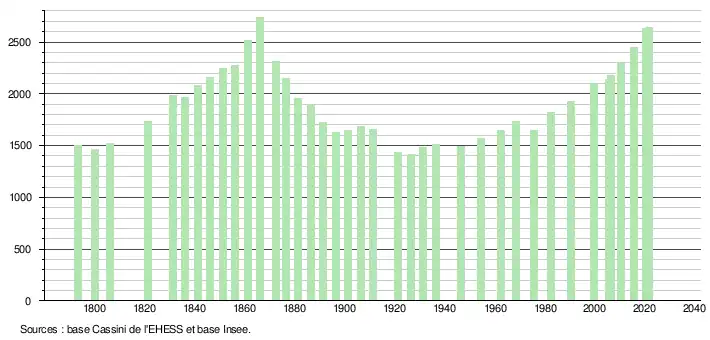 L'évolution du nombre d'habitants est connue à travers les recensements de la population effectués dans la commune depuis 1793. Pour les communes de moins de 10 000 habitants, une enquête de recensement portant sur toute la population est réalisée tous les cinq ans, les populations légales des années intermédiaires étant quant à elles estimées par interpolation ou extrapolation[31]. Pour la commune, le premier recensement exhaustif entrant dans le cadre du nouveau dispositif a été réalisé en 2005[32].