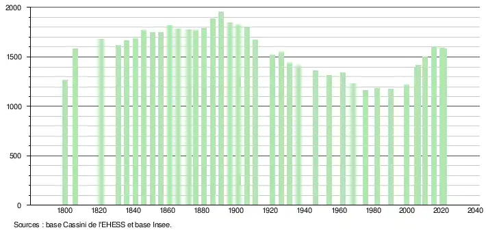L'évolution du nombre d'habitants est connue à travers les recensements de la population effectués dans la commune depuis 1800. Pour les communes de moins de 10 000 habitants, une enquête de recensement portant sur toute la population est réalisée tous les cinq ans, les populations légales des années intermédiaires étant quant à elles estimées par interpolation ou extrapolation[20]. Pour la commune, le premier recensement exhaustif entrant dans le cadre du nouveau dispositif a été réalisé en 2005[21].