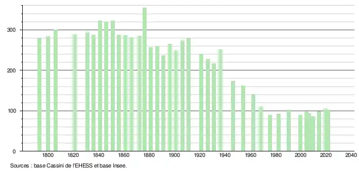L'évolution du nombre d'habitants est connue à travers les recensements de la population effectués dans la commune depuis 1793. Pour les communes de moins de 10 000 habitants, une enquête de recensement portant sur toute la population est réalisée tous les cinq ans, les populations légales des années intermédiaires étant quant à elles estimées par interpolation ou extrapolation[19]. Pour la commune, le premier recensement exhaustif entrant dans le cadre du nouveau dispositif a été réalisé en 2004[20].