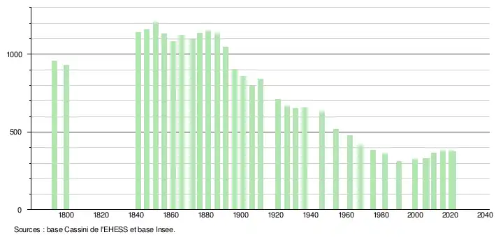 L'évolution du nombre d'habitants est connue à travers les recensements de la population effectués dans la commune depuis 1793. Pour les communes de moins de 10 000 habitants, une enquête de recensement portant sur toute la population est réalisée tous les cinq ans, les populations légales des années intermédiaires étant quant à elles estimées par interpolation ou extrapolation[53]. Pour la commune, le premier recensement exhaustif entrant dans le cadre du nouveau dispositif a été réalisé en 2005[54].