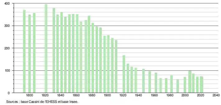 L'évolution du nombre d'habitants est connue à travers les recensements de la population effectués dans la commune depuis 1793. Pour les communes de moins de 10 000 habitants, une enquête de recensement portant sur toute la population est réalisée tous les cinq ans, les populations légales des années intermédiaires étant quant à elles estimées par interpolation ou extrapolation[16]. Pour la commune, le premier recensement exhaustif entrant dans le cadre du nouveau dispositif a été réalisé en 2005[17].