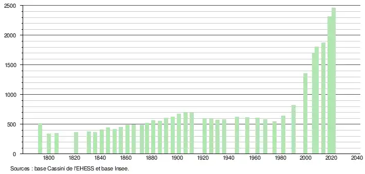 L'évolution du nombre d'habitants est connue à travers les recensements de la population effectués dans la commune depuis 1793. Pour les communes de moins de 10 000 habitants, une enquête de recensement portant sur toute la population est réalisée tous les cinq ans, les populations légales des années intermédiaires étant quant à elles estimées par interpolation ou extrapolation[23]. Pour la commune, le premier recensement exhaustif entrant dans le cadre du nouveau dispositif a été réalisé en 2008[24].
