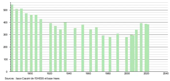L'évolution du nombre d'habitants est connue à travers les recensements de la population effectués dans la commune depuis 1881. Pour les communes de moins de 10 000 habitants, une enquête de recensement portant sur toute la population est réalisée tous les cinq ans, les populations légales des années intermédiaires étant quant à elles estimées par interpolation ou extrapolation[24]. Pour la commune, le premier recensement exhaustif entrant dans le cadre du nouveau dispositif a été réalisé en 2004[25].