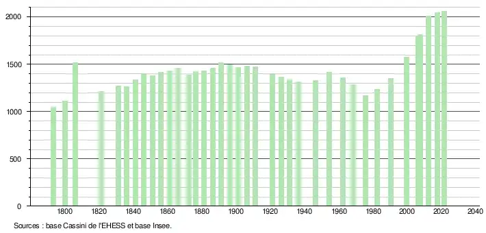 L'évolution du nombre d'habitants est connue à travers les recensements de la population effectués dans la commune depuis 1793. Pour les communes de moins de 10 000 habitants, une enquête de recensement portant sur toute la population est réalisée tous les cinq ans, les populations légales des années intermédiaires étant quant à elles estimées par interpolation ou extrapolation[16]. Pour la commune, le premier recensement exhaustif entrant dans le cadre du nouveau dispositif a été réalisé en 2007[17].
