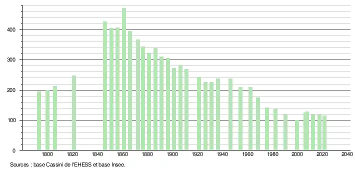 L'évolution du nombre d'habitants est connue à travers les recensements de la population effectués dans la commune depuis 1793. Pour les communes de moins de 10 000 habitants, une enquête de recensement portant sur toute la population est réalisée tous les cinq ans, les populations légales des années intermédiaires étant quant à elles estimées par interpolation ou extrapolation[21]. Pour la commune, le premier recensement exhaustif entrant dans le cadre du nouveau dispositif a été réalisé en 2007[22].