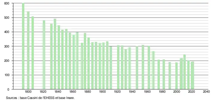 L'évolution du nombre d'habitants est connue à travers les recensements de la population effectués dans la commune depuis 1793. Pour les communes de moins de 10 000 habitants, une enquête de recensement portant sur toute la population est réalisée tous les cinq ans, les populations légales des années intermédiaires étant quant à elles estimées par interpolation ou extrapolation[20]. Pour la commune, le premier recensement exhaustif entrant dans le cadre du nouveau dispositif a été réalisé en 2005[21].