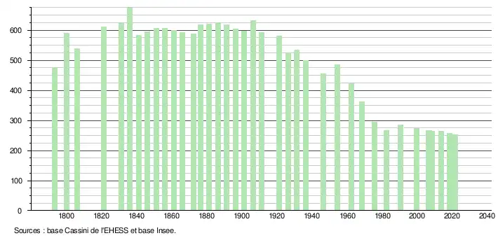L'évolution du nombre d'habitants est connue à travers les recensements de la population effectués dans la commune depuis 1793. Pour les communes de moins de 10 000 habitants, une enquête de recensement portant sur toute la population est réalisée tous les cinq ans, les populations légales des années intermédiaires étant quant à elles estimées par interpolation ou extrapolation[30]. Pour la commune, le premier recensement exhaustif entrant dans le cadre du nouveau dispositif a été réalisé en 2008[31].