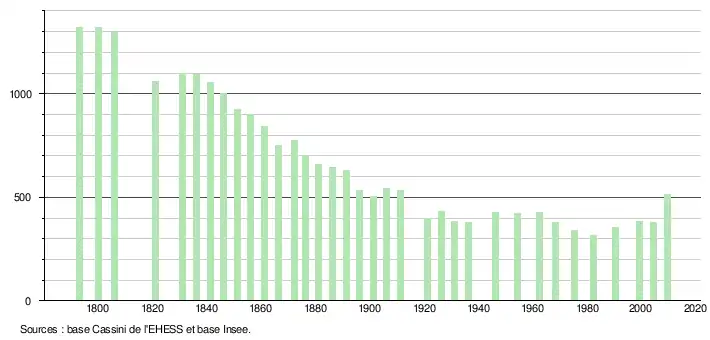 L'évolution du nombre d'habitants est connue à travers les recensements de la population effectués dans la commune depuis 1793. À partir du , les populations légales des communes sont publiées annuellement dans le cadre d'un recensement qui repose désormais sur une collecte d'information annuelle, concernant successivement tous les territoires communaux au cours d'une période de cinq ans. Pour les communes de moins de 10 000 habitants, une enquête de recensement portant sur toute la population est réalisée tous les cinq ans, les populations légales des années intermédiaires étant quant à elles estimées par interpolation ou extrapolation[6]. Pour la commune, le premier recensement exhaustif entrant dans le cadre du nouveau dispositif a été réalisé en 2004[7],[Note 1].